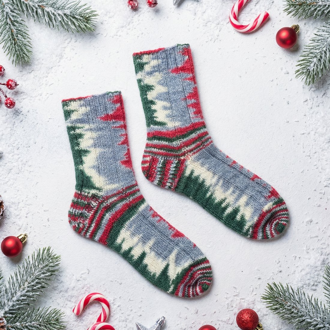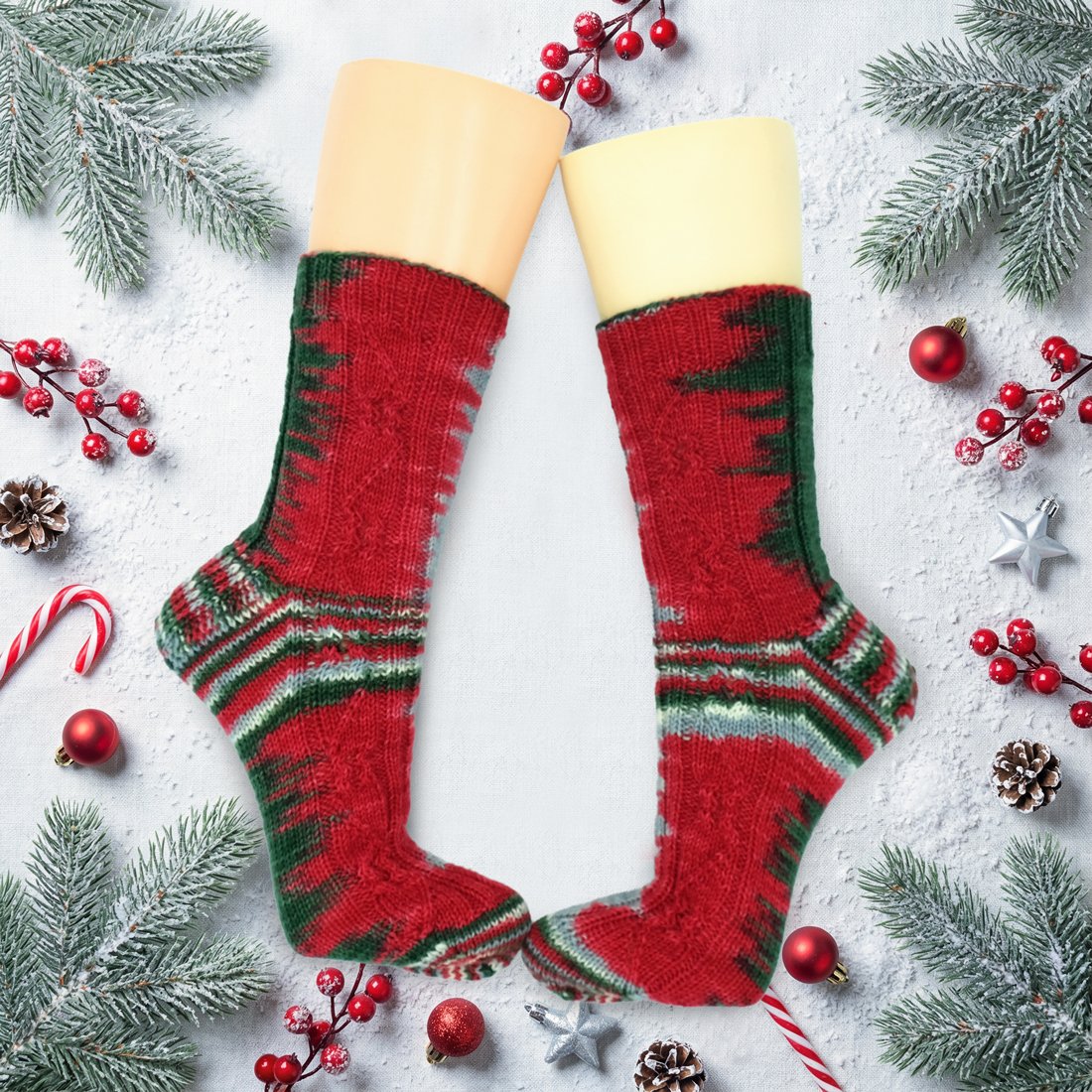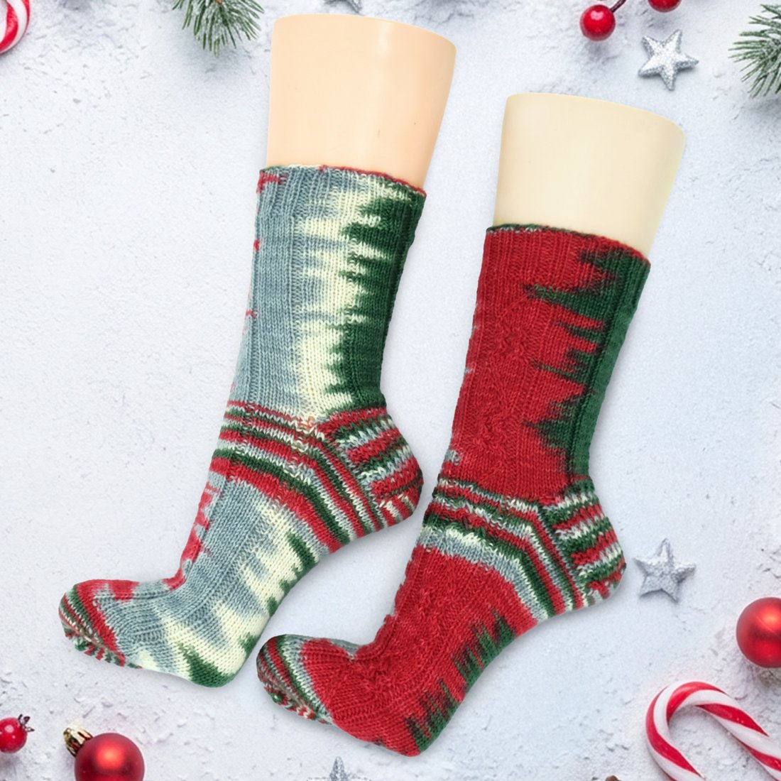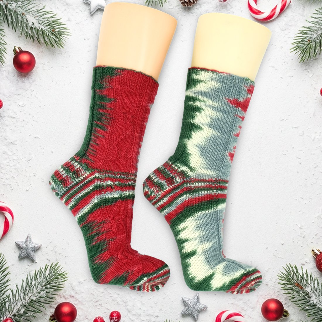 Die Socken in meinem Beispiel wurden mit 64 Maschen und Nadelstärke 2,5 mm gestrickt. Es kann sich aber je nach Maschenzahl und Strickfestigkeit ein anderes Strickbild ergeben!
